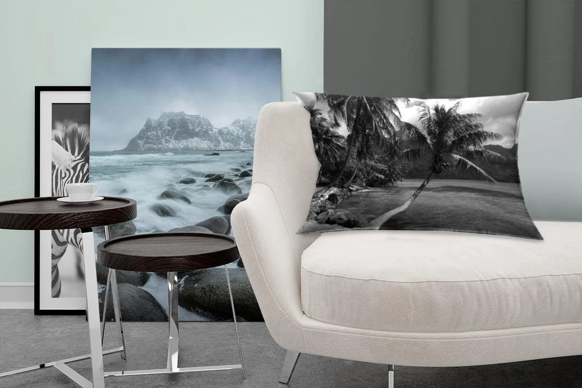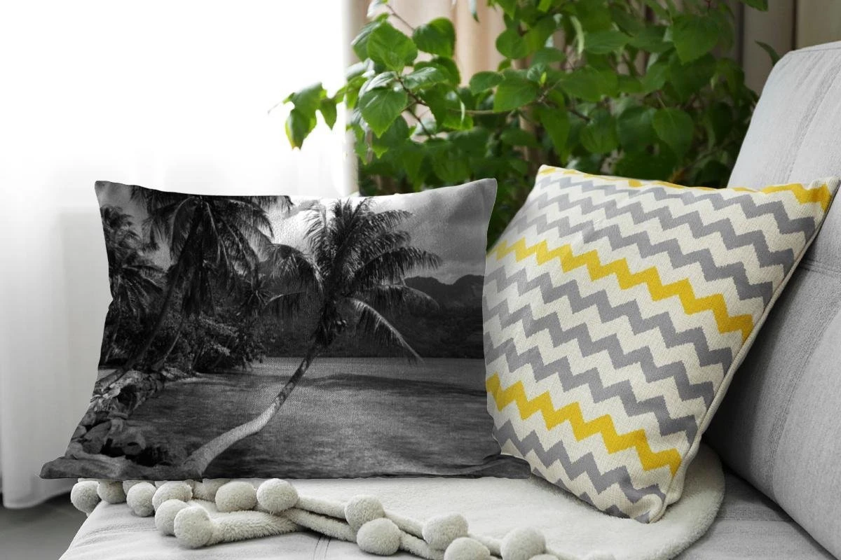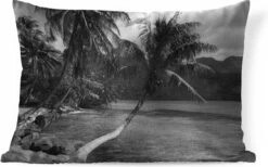 Sierkussen – Palmbomen op het strand van Mo’orea in zwart wit – Kussens woonkamer