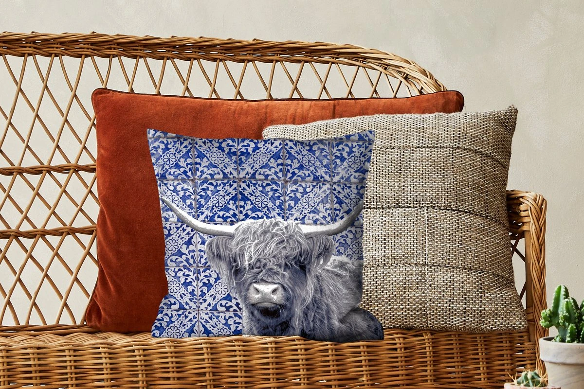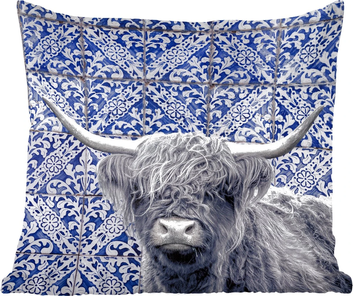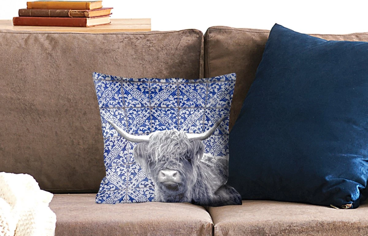 Sierkussen – Schotse hooglander – Delfts blauw – Zwart – Wit – Kussens woonkamer