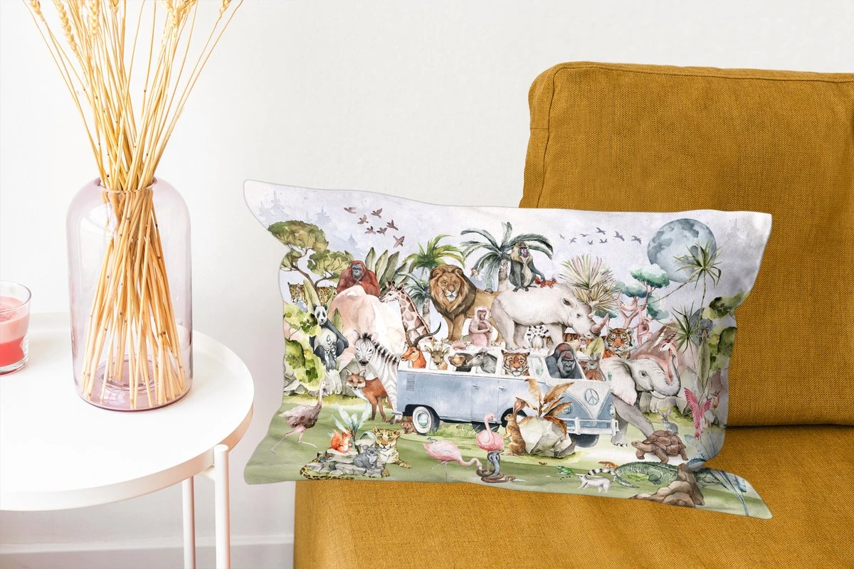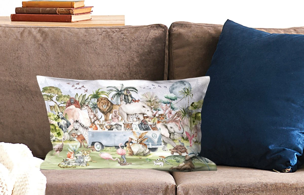 Fleur het interieur van jouw kinderkamer helemaal op met dit kussen! Op het kussen staan wilde dieren samen met een vintage busje afgebeeld.